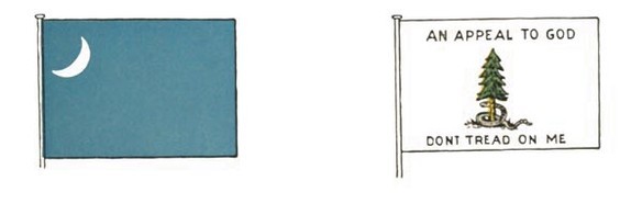 On the 8th day of February, 1776, one of the committee on naval affairs, Mr. Gadsden, who represented South Carolina in the General Congress, presented that body with a flag that was made of yellow silk with a rattlesnake upon it (see Drayton’s American Revolution, Vol. II, page 172; see Fig. 10). No one can tell what became of this flag, yet it was placed in the hall of Congress in a conspicuous place near the seat of John Hancock. Some claim that it was this flag that Paul Jones hoisted on his ship, and others that it was taken South to Fort Moultrie. So therefore we have, as late as April, 1776, a navy of seventeen vessels, proper committees of Congress to look after them, a commander-in-chief, to wit: Esek Hopkins, who was named for that position December 22, 1775; but no national flag had been made nor one even adopted in July, 1776 (see Jay’s letter to the committee), nor in October (see Richard’s letter, dated October 15, 1776), both written months after the date fixed upon in the Ross claim; but the supposition is that, so far as the navy is concerned, it either flew the Grand Union or a flag similar to the Gadsden device, and this is borne out by the records. As to who was the first naval officer to raise the first American flag to the peak of his vessel and capture the first prize, we only have to quote ex-President John Adams, who wrote from Quincy in 1813 to Vice-president Gerry as follows: