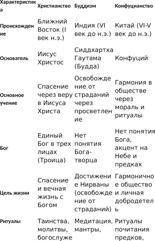 — Ритуалы: Христианство — таинства и богослужения. Буддизм — медитация и пуджи. Конфуцианство — ритуалы почитания предков и церемонии.