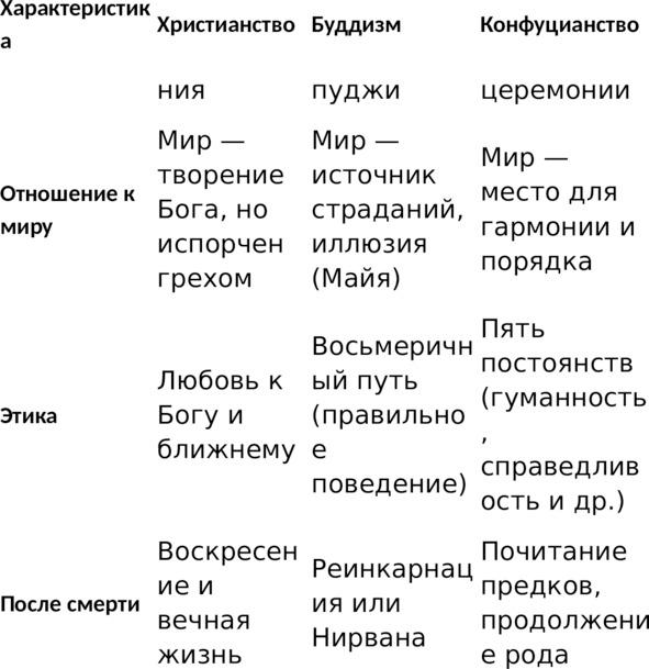 — Цель жизни: В христианстве — спасение и вечная жизнь с Богом. В буддизме — освобождение от страданий через Нирвану. В конфуцианстве — достижение гармонии в обществе и личная добродетель.