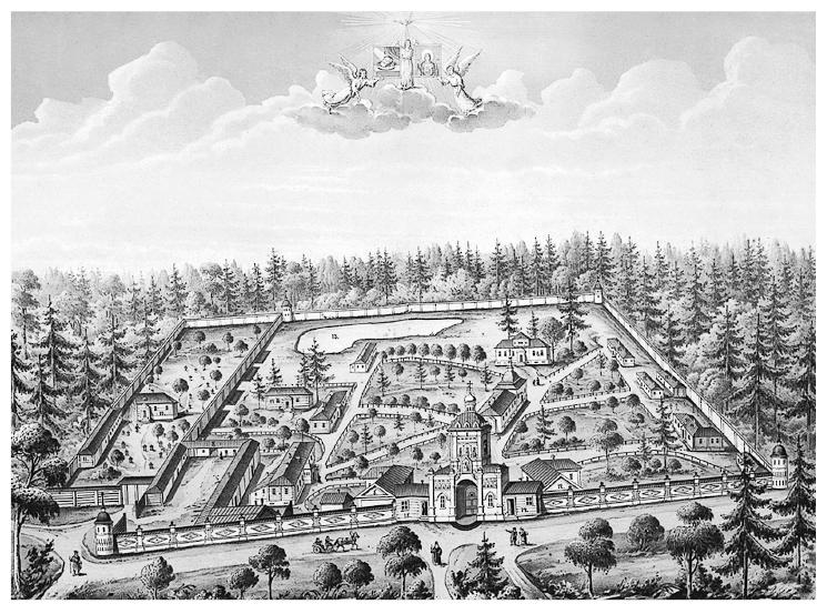 Оптина пустынь. Вид сверху на скит Иоанна Предтечи. Гравюра 1881 года{6}