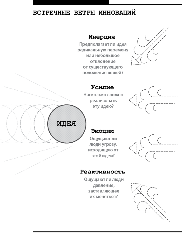 Все новые идеи состоят из четырёх основных элементов, и каждому противостоит конкретная сила трения. Первый элемент — это степень изменений, которые влечёт за собой внедрение инновации. Предполагает ли инновация серьёзное отступление от статус-кво или это лишь незначительное изменение того, что существовало раньше? Этот вопрос определяет уровень инерции, с которой столкнётся инновация. Радикальным идеям, скорее всего, будет противостоять сильная инерция, поскольку люди по своей природе не доверяют незнакомым и непроверенным идеям и отвергают их.