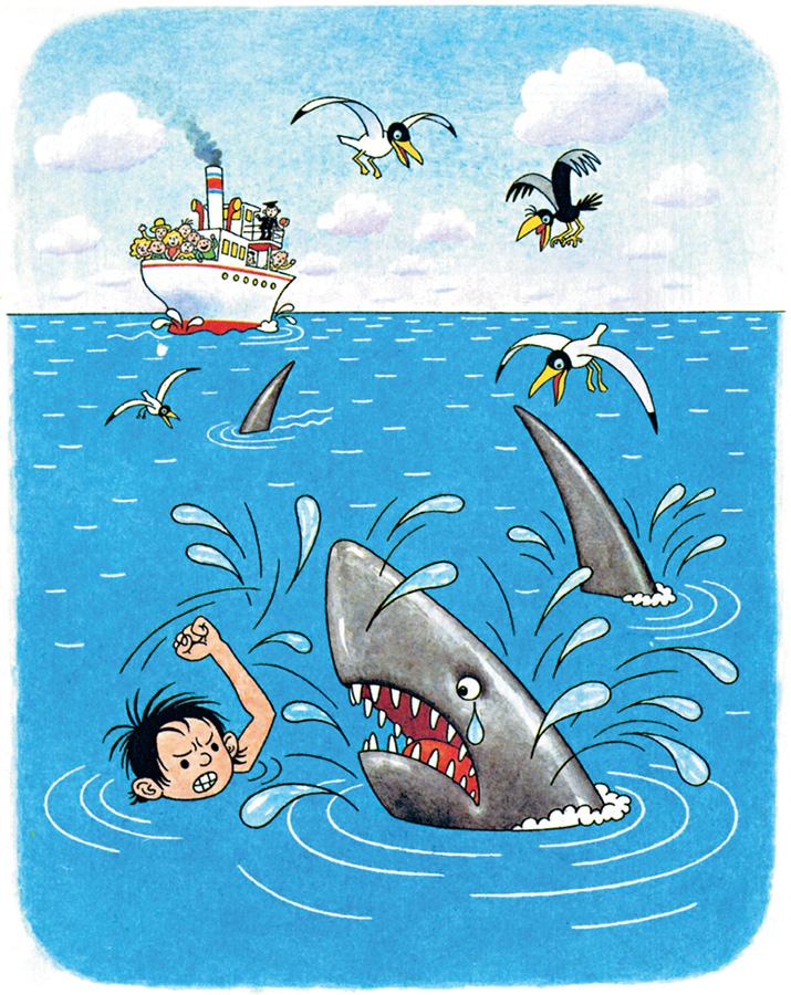 – А я один раз купался в море, – говорит Мишутка, – и на меня напала акула. Я её бац кулаком, а она меня цап за голову – и откусила.