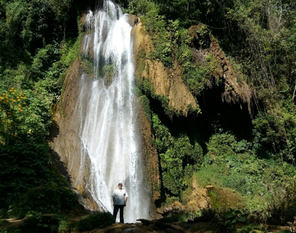 Наконец, расширилось внутреннее пространство, и мы увидели гигантские сталактиты, свисающие откуда-то сверху. И свет из провала в земле. Двигаться нормально мне мешала раненая нога. Где-то порезал ступню. И теперь из-под носка медленно сочилась теплая липкая кровь… наконец, мы выбрались из пещеры и через несколько десятков метров оказались перед гигантским красивейшим горным водопадом в лесу. Ощущение фантастическое. Продолжив путь, пришлось многократно перебираться по скользкому бревну через бурную реку то к одному берегу, то к другому.