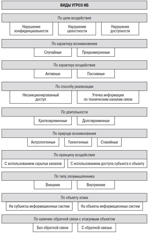 Иногда угрозы ИБ возникают из-за халатности сотрудников, которые забывают флэшки с ценной информацией, а также из-за техногенных сбоев, например, отключения электричества, или непреднамеренных ошибок при написании программного обеспечения. При расчете рисков ИБ можно опираться на частоту таких инцидентов, и проектировать защитные меры, исходя из данных статистики. Случайные угрозы наряду с преднамеренными можно минимизировать за счет применения организационных и технических мер. Например, с помощью шифрования можно защитить данные на компьютерах и съемных носителях. На рис. 1 приведена классификация угроз ИБ и их возможных источников.
