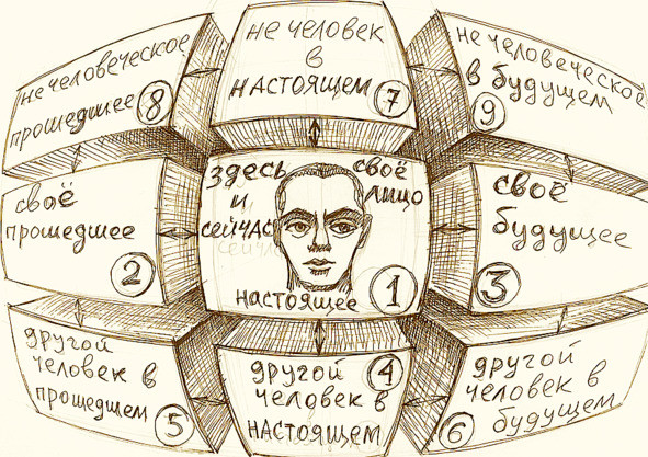 В центре схемы, как мы видим, находится осознающая в полной мере себя личность в настоящем времени. Позиция номер два уже характеризует человека поглощенного своим прошлым. Позиция три — будущим.