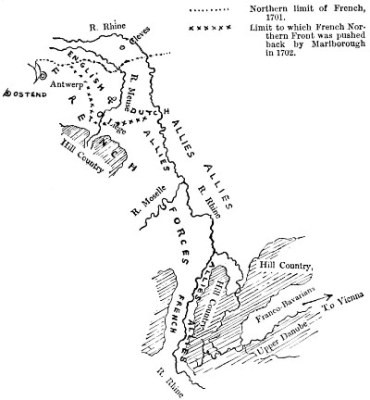 The frontier between the Spanish Netherlands and Holland—that is, between modern Belgium and Holland—was the frontier between the forces of Louis XIV. and those of opponents upon the north. Thus Antwerp and Ostend were in the hands of the Bourbon, for the Spanish Netherlands had passed into the hands of the French king’s grandson, and the French and Spanish forces were combined. Further east, towards the Upper Rhine, a French force lay in the district of Cleves, and all the fortresses on the Meuse, running in a line south of that post, with the exception of Maestricht, were in French hands.