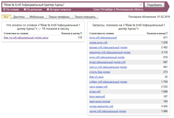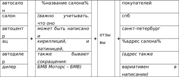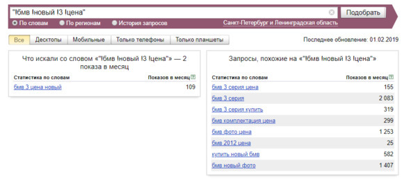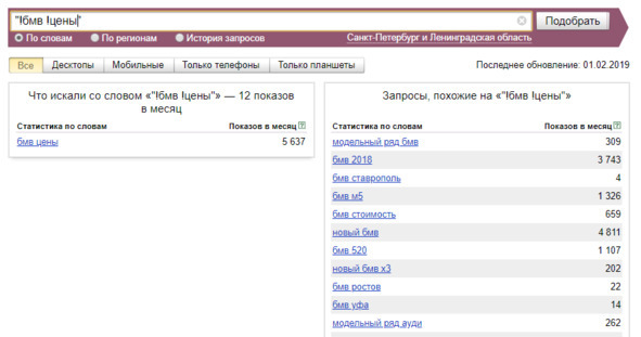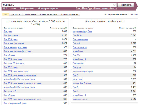 Например, мне нравится ключ «бмв +в спб официальный дилер». Что в нём хорошего? Он включает в себя много других ключей. То есть, вписав данную фразу в текст, мы вместе с этим конкретным запросом будем продвигаться и по более коротким, входящим в его состав, запросам. Круто ведь, да? Кроме того, можно добавить к этой фразе слово «цены». Так мы ещё больше увеличим число входящих в неё запросов.