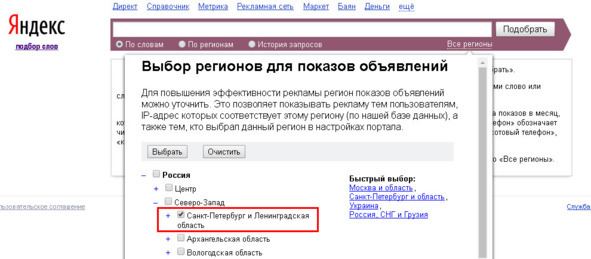Переходим по ссылке. Первое, что нужно сделать — это задать региональность. Нам интересны запросы по Санкт-Петербургу и Ленобласти, поэтому этот регион и выбираем: