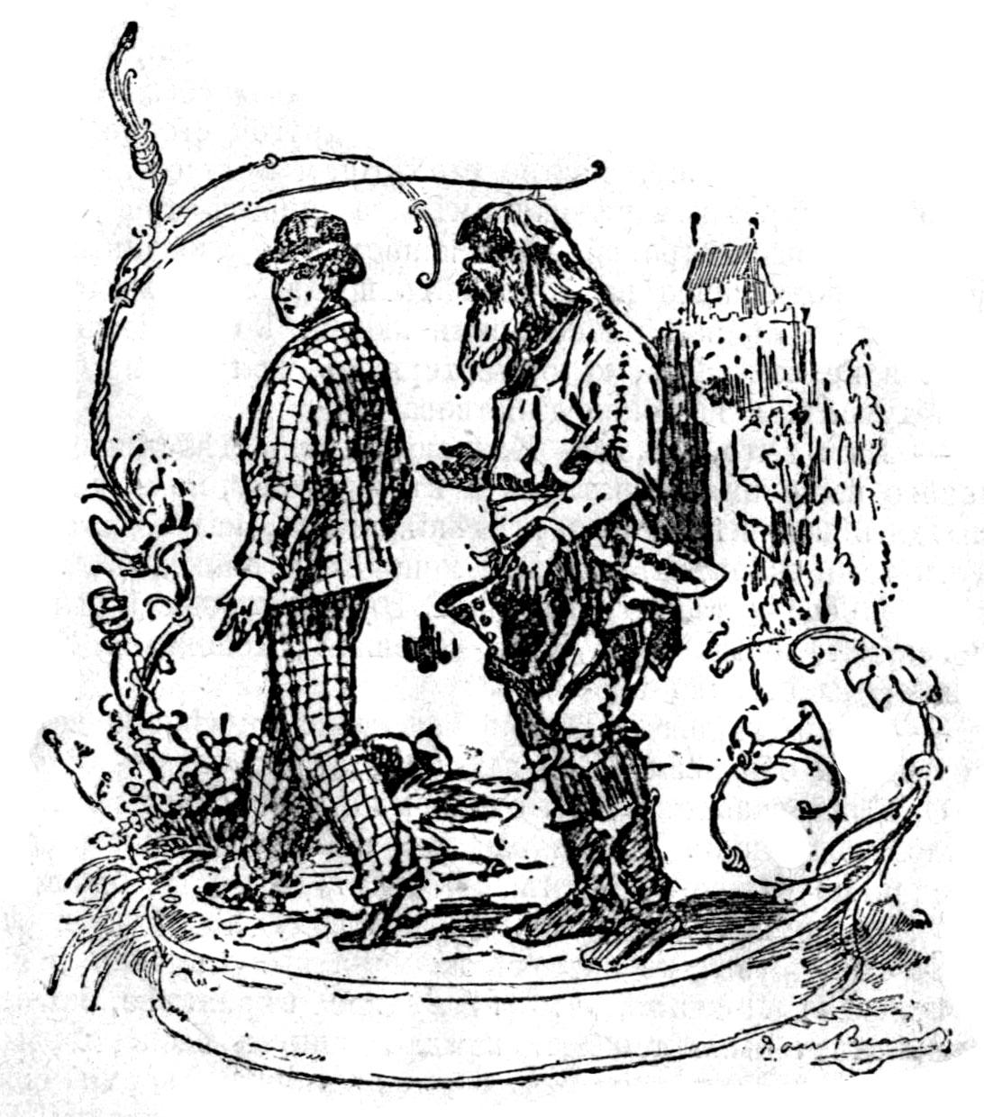 Затем он объяснил, что состоит в поварах, потому не имеет времени для болтовни, хотя вообще не прочь бы поболтать. Особенно ему любопытно было бы узнать, откуда я взял такую странную одежду. Оглянувшись кругом, он указал мне на человека, которому нечего делать, который, кажется, сам желает со мной поговорить. Это был тоненький воздушный мальчик в узких красных панталонах, которые делали его похожим на раздвоенную морковь. Верхняя часть его костюмы была из голубого шелка с изящным воротником и такими же манжетами. На его длинных желтых локонах была кокетливо надета розовая шелковая шапочка с пером. По лицу было видно, что он добр, а из веселого настроения можно было заключить, что он доволен собой.