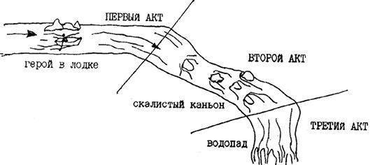 Первый акт. Диаграмма изображает реку, несущуюся в горном ущелье. В первом акте вы пускаете своего героя в плавание в утлом челноке. Течение стремительно. У героя нет пути назад. Река делает крутой поворот. Не видно, что вас ждет впереди.