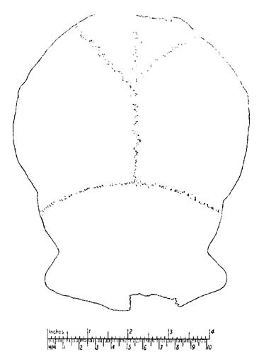 "In norma occipitalis the sagittal suture appears at the summit of a ridge whose parietal sides slope outwards forming with each other an angle of 138°, as far as the parietal eminences. From these the sides drop vertically down to the large mastoid processes. The intermastoid width at the tips of the processes is 115, but at the supramastoid crest is 148 (Fig. 9).