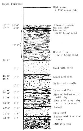 If now we travel about 30 miles a little west of north we shall arrive near the shore of the Wash about half way across its southern coast line at Sutton Bridge. Here I had an opportunity of seeing the material of which the alluvium is composed. With a view to securing a sound base for the foundation of the piers of the Midland and Great Northern Railway bridge an excavation was made through the whole of the Fen Beds down to the Boulder Clay which as I have already stated was reached at a depth of 73 feet. The clerk of the works kindly gave me the following measurements (Fig. 5).