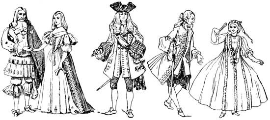 A studied negligence, an elegant déshabillé prevailed in the Stuart Court, particularly after the Restoration. Charles II.'s bevy of beauties are similarly attired, and the pictures in Hampton Court show us women whose snowy necks and arms are no longer veiled, and whose gowns of rich satin, with voluminous trains, are piled up in the background. Engravings and drawings which may be seen in every printseller's window make special illustrations of this period unnecessary.