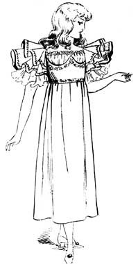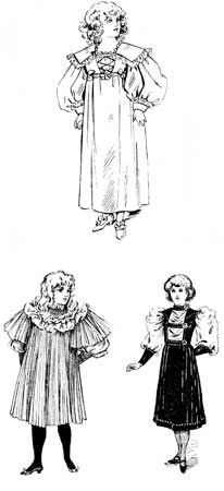 How much we owe to pioneers of children's dress reform, and especially to Messrs. Liberty, who evolved what is generally known as the æsthetic style in dress. From sketches courteously placed at my disposal, I am enabled to put before the reader examples of children's clothing which are artistic in form, light of texture, and which in no way impede the physical development. Those who have the care of children should remember what a sacred charge is imposed upon them, and that their future health mainly depends, upon the manner in which they are clothed during the first few years of life. There must be no tight bands, belts, or garters to prevent circulation and to cause organic troubles; and where corsets are dispensed with, as happily they are in many cases where growing girls are concerned, the weight of the clothing should be borne by the shoulders, not the waist, and this is ensured by cutting undergarments in the princess or combination forms. Many young people suffer from being carelessly shod, and hideous malformations of the feet arise in consequence, while obscure diseases of the brain can sometimes be traced to heavy head-gear, and the strain of over-study. Hats should be of light construction, and afford a grateful shade to the eyes, if that far-reaching ailment of civilisation, short sight, is to be successfully combatted; and special attention must be paid to infants, who may often be seen in public thoroughfares with a hot sun beating down upon them, and the nurse oblivious to the fact. The sight of a tender infant entrusted to the care of a young woman, who has not the glimmering of a notion of how to look after its fragile body, must fill any right-minded person with indignation. Is it unreasonable to expect those who undertake the charge of children to acquaint themselves with at least an elementary knowledge of the construction and functions of the human body? The ignorance of the average nursemaid is appalling; and though a board school education may have acquainted her with the mysteries of the First Book of Euclid, or the rudiments of music, the curriculum rarely includes the simplest instruction on the healthy training of children; and, in consequence, the high rate of infant mortality in this country is a national disgrace.