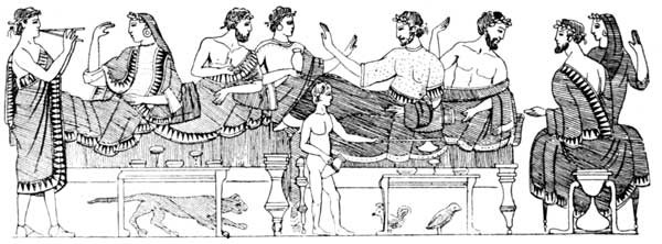 The costume of our progenitors was chiefly remarkable for its extreme simplicity; and, as far as we can gather, no difference in design was made between the sexes. A few leaves entwined by the stalks, the feathers of birds, the bark of trees, or roughly-dressed skins of animals were probably regarded by beaux and belles of the Adamite period as beautiful and appropriate adornments for the body, and were followed by garments made from plaited grass, which was doubtless the origin of weaving, a process which is nothing more than the mechanical plaiting of hair, wool, flax, &c. In many remote districts these primitive fashions still prevail, as, for example, in Madras, where, at an annual religious ceremony, it is customary for the low caste natives to exchange for a short period their usual attire for an apron of leaves. In the Brazilian forests the lecythis, or "shirt tree," is to be found, from which the people roll off the bark in short lengths, and, after making it pliable in water, cut two slits for the arm-holes and one for the neck, when their dress is complete and ready for use. The North American Indian employs feathers for purposes of the toilet, and many African tribes are noted for their deftly-woven fabrics composed of grass and other vegetable fibres, while furs and skins are essential articles of dress in Northern latitudes. Perhaps the earliest specimen of a modiste's bill in existence has recently been found on a chalk tablet at Nippur, in Chaldea. The hieroglyphics record ninety-two robes and tunics: fourteen of these were perfumed with myrrh, aloes and cassia. The date of this curious antique cannot be less than two thousand eight hundred years before the Christian era. In ancient times it must be remembered that the principal seats of civilisation were Assyria and Egypt, and upon these countries Western nations depended for many of the luxuries of life. The Jews derived their fine fabrics from the latter place, which was particularly noted for its linen manufactures and for magnificent embroideries, of which the accompanying illustration will give some idea. Medes and Babylonians, of the highest class, partially arrayed themselves in silk, which cost its weight in gold, and about the time of Ezekiel (B.C. 594) it is known to have been used in the dress of the Persians. It is a remarkable circumstance that this animal product was brought to the West manufactured in cloth, which was only half silk; and it is said the plan was devised of unravelling the stuff, which was rewoven into cloth of entire silk. Owing to its high price, the Romans forbade its being used for the entire dress by men, complete robes of silk being reserved for women. It is numbered among the extravagant luxuries of Heliogabalus that he was the first man who wore a silken garment, and the anecdote is well known of the Emperor Aurelian, who refused, on the ground of its extravagant cost, a silk dress which his consort earnestly desired to possess.