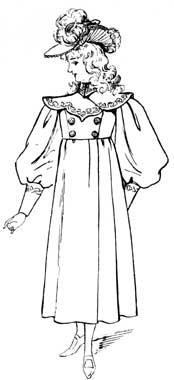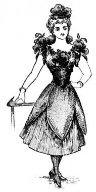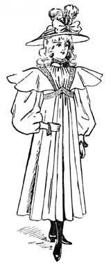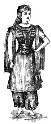 These were in time followed by the bell-shaped skirts worn at the accession of Her Majesty Queen Victoria, during whose reign fashion has indeed run riot. The invention of the sewing machine was the signal for the appearance of frills and furbelows, and meretricious ornament of every kind. In the middle of the present century crinolines were again to the fore, skirts were proportionately wide and generally flounced to the top. The bodice terminated at the waist with a belt; but in some cases a Garibaldi, or loose bodice of different texture, was substituted. The next change to be noted was that hideous garment the "polonaise," which was a revival of, and constructed on similar lines to, the "super froc" of the Middle Ages. For many years English ladies, with a supreme disregard for the appropriate, wore this with a skirt belonging to an entirely different costume. But at last people got nauseated with these abominations, and under the gentle sway and influence of "Our Princess" a prettier, more useful and rational costume appeared. In 1876 the graceful Princess dress, which accentuated every good point in the figure, was generally worn; and though this costume in the latter part of its career was fiercely abused by the rotund matron and Mrs. Grundy, for clinging too closely to the lines of the human form, it was distinctly an advance as regards health and beauty on the varying styles which preceded it.