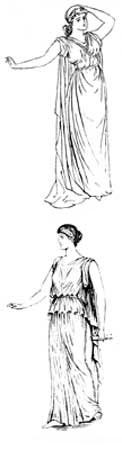The early Greek dress, or chiton, was a very simple contrivance, reaching to the feet. If ungirdled, it would trail on the ground; but generally it was drawn through the zone or waistbelt in such a manner that it was double to the extent of about thirty inches over the vital organs of the body. The great distinction between male and female dress consisted in the length of the skirt. The trimmings were of embroidery, woven diapers, figure bands with chariots and horses; and, in some cases, glass ornaments and thin metal plates were applied. Among the working classes the chiton was, of course, homespun, or of leather.