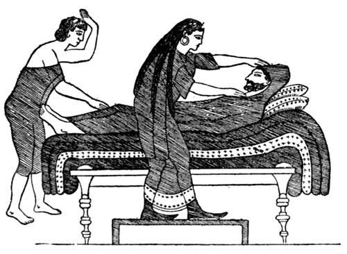 The Egyptian labouring classes allowed their children to be nude, and infants were unfamiliar with swaddling clothes. The working man and boy had simply a loin cloth and girdle, and the girl a loose tunic fastened with strings at the neck and reaching to her feet. On the other hand, children of the upper classes in Egypt were repetitions of their elders on a small scale. Girls wore a linen skirt embroidered in colours and fastened with a bright sash, or suspended from the shoulders, and over this a loose transparent robe with long sleeves. The male costume consisted of a loin cloth, and a full robe with short sleeves, or a tunic, and both sexes had elaborately curled or plaited wigs, as the natural hair was only allowed to grow in times of mourning.