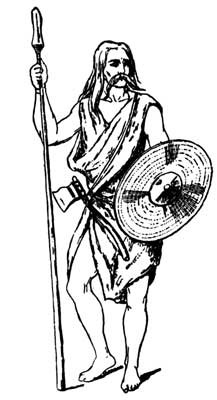 One of the earliest descriptions of the female dress in Britain is that of Boadicea, the Queen of the Iceni, whom we are told wore a tunic woven chequerwise in purple, red, and blue. Over this was a shorter garment open on the bosom, and leaving the arms bare. Her yellow hair flowed over her shoulders, upon which rested an ample cloak, secured by a fibula (brooch). A torque, or necklet, was also worn; a pair of bronze breastplates as a protection from the Roman arrows, and her fingers and arms were covered with rings and bracelets.