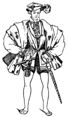 In the dress of the Blue-coat School (Christ's Hospital), we see the ordinary costume of boys of the Tudor period. It consisted of a long coat reaching to the heels and knee-breeches, a striped vest, yellow stockings, and a small round cap placed on the side of the head. The dress of little girls may be found on various monumental effigies, in which they appear like their mothers, in full skirts, sometimes distended by a fardingale, the body imprisoned in whalebone to the hips, a folded ruff encircling the neck, and their stockings (according to Stubbs) were of the finest yarn, silk, thread, or cloth that could possibly be had, of changeable colours, cunningly knit, with curiously indented points, clocks, and open seams. The shoes were of black, green, white and yellow velvet, or of leather stitched with silk and embroidered with gold and silver all over the foot.