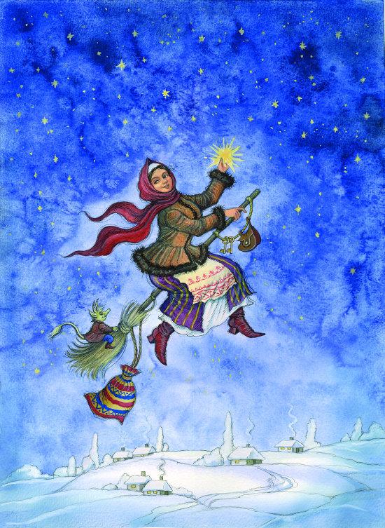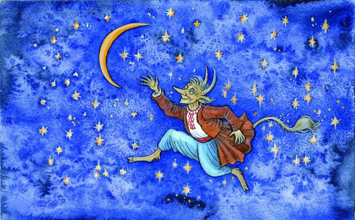 Последний день перед Рождеством прошел. Зимняя, ясная ночь наступила. Глянули звезды. Месяц величаво поднялся на небо посветить добрым людям и всему миру, чтобы всем было весело колядовать[1] и славить Христа. Морозило сильнее, чем с утра; но зато так было тихо, что скрып мороза под сапогом слышался за полверсты. Еще ни одна толпа парубков не показывалась под окнами хат; месяц один только заглядывал в них украдкою, как бы вызывая принаряживавшихся девушек выбежать скорее на скрыпучий снег. Тут через трубу одной хаты клубами повалился дым и пошел тучею по небу, и вместе с дымом поднялась ведьма верхом на метле.