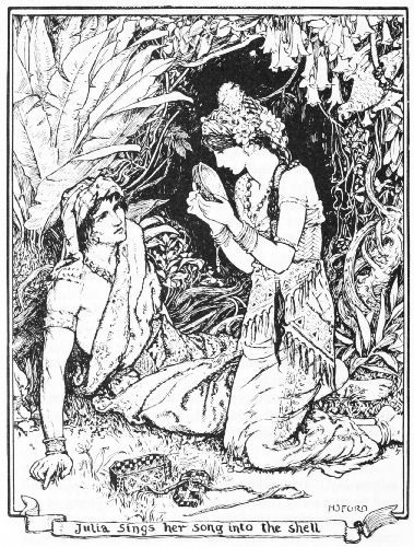 When the water-nymphs, who were hiding in readiness, had caught her and dragged her out of the sight of her terrified maidens, she herself had not had time to be frightened. They swam with her quickly by strange underground ways to a palace so splendid that her father’s seemed but a poor cottage in comparison with it, and when she recovered from her astonishment she found herself seated upon a couch, wrapped in a wonderful robe of satin fastened with a silken girdle, while beside her knelt a young man who whispered the sweetest speeches imaginable in her ear. The gnome, for he it was, told her all about himself and his great underground kingdom, and presently led her through the many rooms and halls of the palace, and showed her the rare and wonderful things displayed in them till she was fairly dazzled at the sight of so much splendour. On three sides of the castle lay a lovely garden with masses of gay, sweet flowers, and velvet lawns all cool and shady, which pleased the eye of the princess. The fruit trees were hung with golden and rosy apples, and nightingales sang in every bush, as the gnome and the princess wandered in the leafy alleys, sometimes gazing at the moon, sometimes pausing to gather the rarest flowers for her adornment. And all the time he was thinking to himself that never, during the hundreds of years he had lived, had he seen so charming a maiden. But the princess felt no such happiness; in spite of all the magic delights around her she was sad, though she tried to seem content for fear of displeasing the gnome. However, he soon perceived her melancholy, and in a thousand ways strove to dispel the cloud, but in vain. At last he said to himself: ‘Men are sociable creatures, like bees or ants. Doubtless this lovely mortal is pining for company. Who is there I can find for her to talk to?’