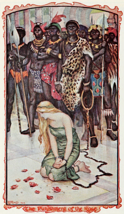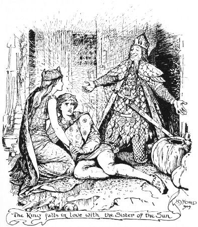 They saw at last that there was nothing for it but to carry to the king the sad tidings of his beloved daughter’s disappearance. And what great weeping and lamentation there was in the palace when the dreadful news was told! The king tore his robes, dashed his golden crown from his head, and hid his face in his purple mantle for grief and anguish at the loss of the princess. After the first outburst of wailing, however, he took heart and hurried off to see for himself the scene of this strange adventure, thinking, as people will in sorrow, that there might be some mistake after all. But when he reached the spot, behold, all was changed again! The glittering grotto described to him by the maidens had completely vanished, and so had the marble bath, the bower of jasmine; instead, all was a tangle of flowers, as it had been of old. The king was so much perplexed that he threatened the princess’s playfellows with all sorts of punishments if they would not confess something about her disappearance; but as they only repeated the same story he presently put down the whole affair to the work of some sprite or goblin, and tried to console himself for his loss by ordering a grand hunt; for kings cannot bear to be troubled about anything long.