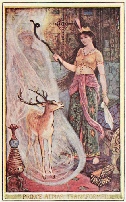 Then he began to perceive that something was amiss, and, throwing off the mortal form that encumbered him, he flew out of the palace, and soared high into the air, and saw the fugitive princess in the far distance just as the swift horse carried her across the boundary of his dominions.