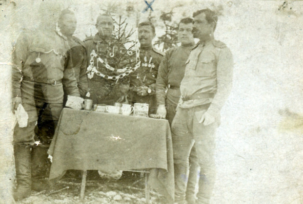 — Читаю: «На празднике Рождество Христово с друзьями на елке. Иван Мусатов. 25 декабря 1916г. Карпаты». Это однозначно, что идет первая мировая война. Полевой лагерь. Смотри: елка не срублена, а просто к ней приставлен стол с, наспех накрытой скатертью. На столе закуски нет, зато стоит красивая бутылка спиртного в плетеной корзиночке. Раньше молдавское вино в таких корзиночках продавали.