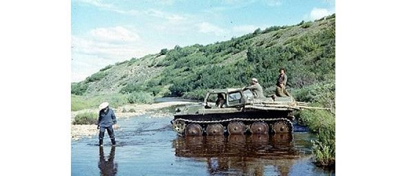 Передвигались мы на стареньком послужившем вездеходе ГАЗ-47 и как-то встали на речной галечниковой косе. Речка в этом месте делала узкую вытянутую петлю-меандру, подходя вплотную к склону и тут же отходя от него. Склон был густо залесен лиственницей и кустарником, но в нижней части шла тропинка. Речку с тропинки было не видно и стоянку нашу на петле-меандре можно было легко проскочить. Хотя в километре выше по течению впадали два ручейка со рвами в приустьевой части — не проскочишь и ориентир отличный. А ниже в паре километрах, вообще слияние с правой составляющей — еще более заметный ориентир.
