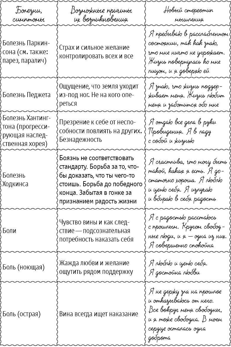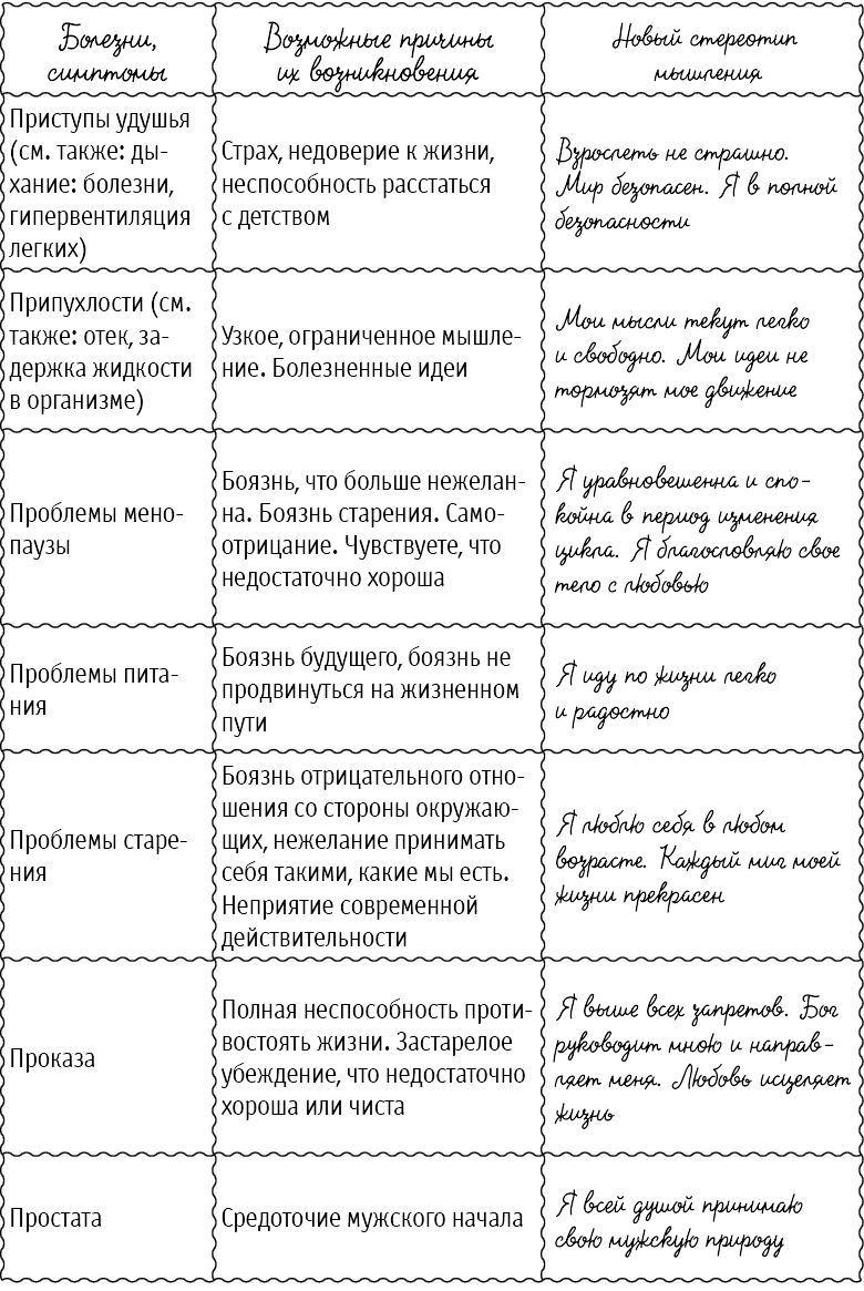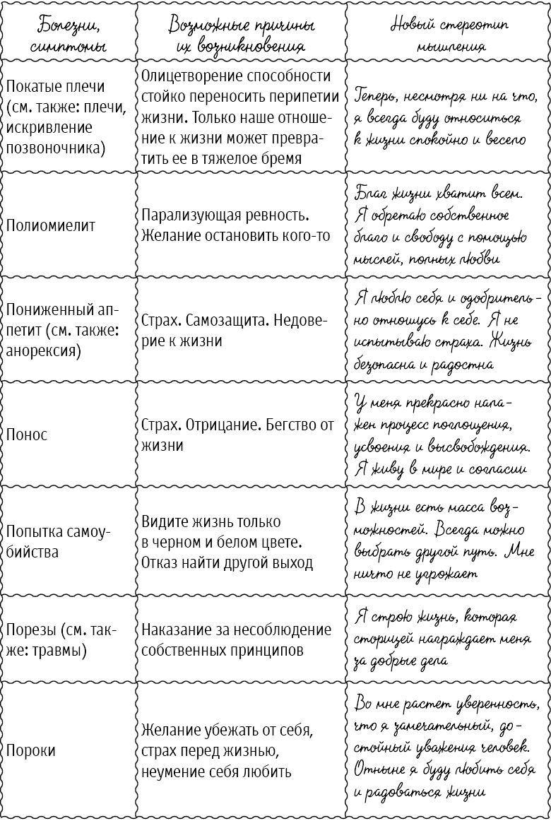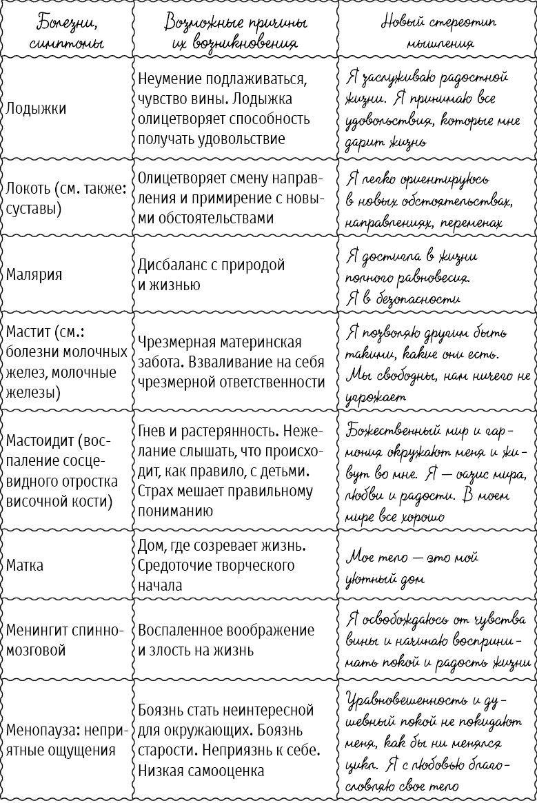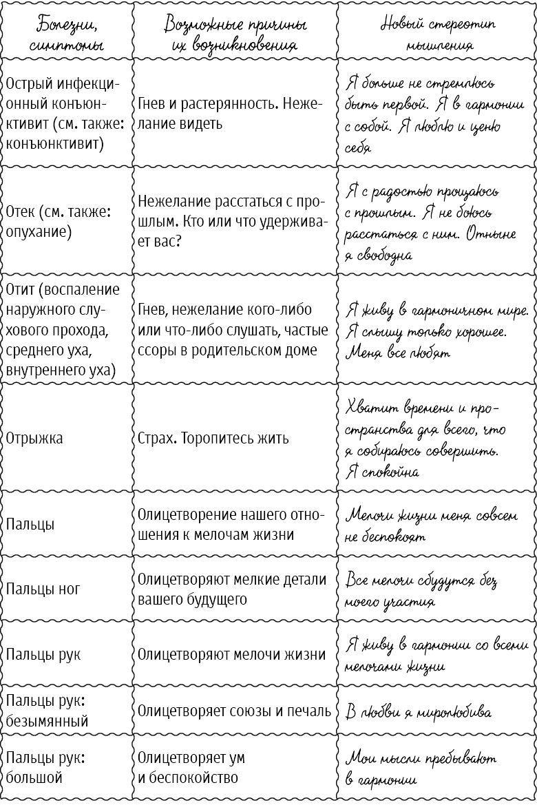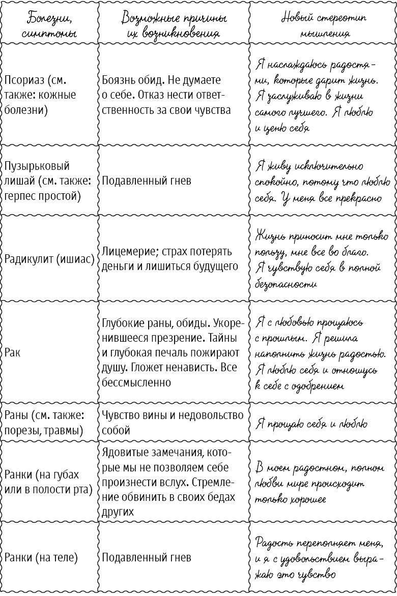 Наибольшее количество болезней тела вызывают следующие ментальные причины: критицизм, гнев, обида и вина. Например, критицизм, исповедуемый довольно долгое время, приводит людей к такому заболеванию, как артрит. Гнев в конечном итоге вызывает ожоги на теле и оставляет рубцы. Старые обиды пожирают человека и оборачиваются опухолями и раком. Вина всегда ищет наказание и ведет к боли. Насколько легче освободиться от негативных стереотипов мышления, пока мы здоровы, чем пытаться отделаться от них, будучи в панике от угрозы операции!