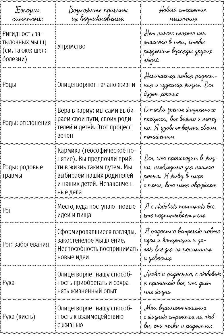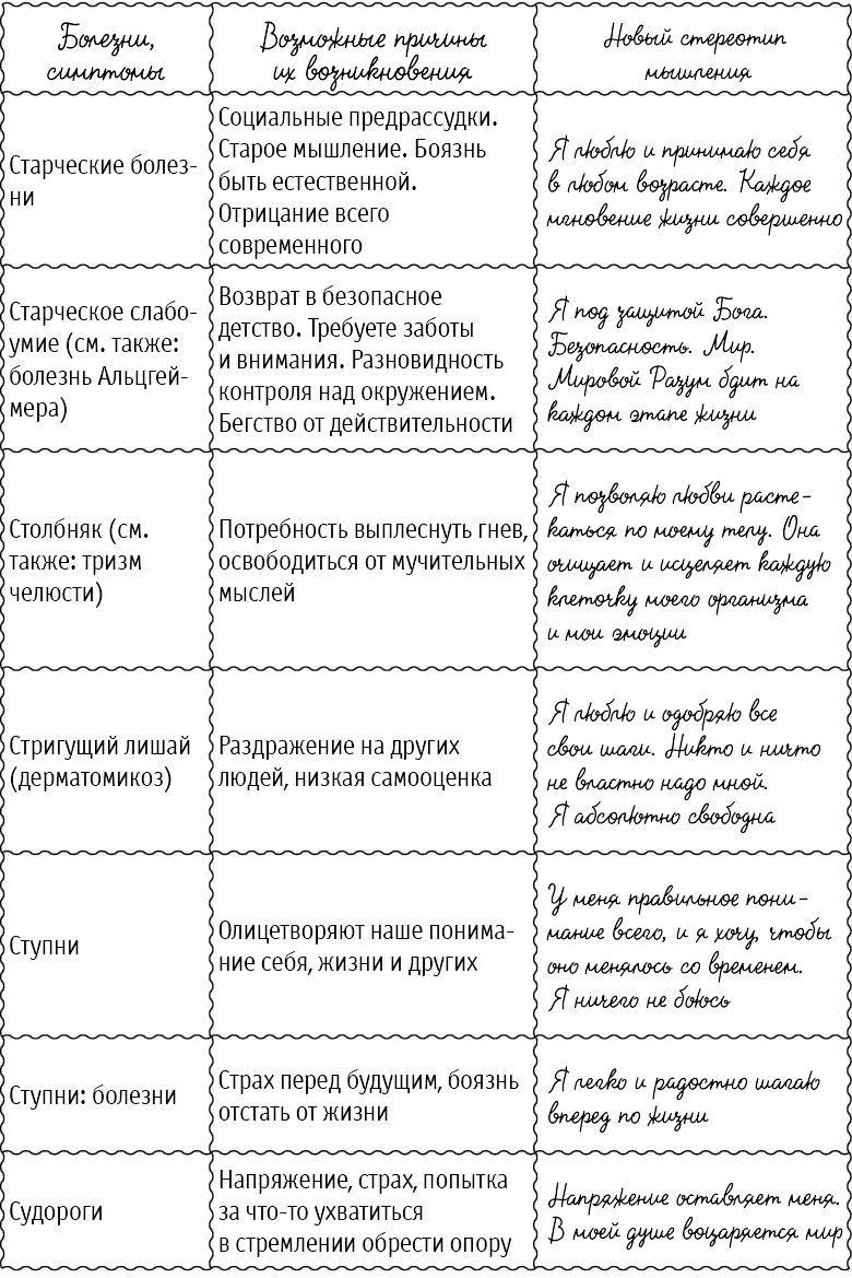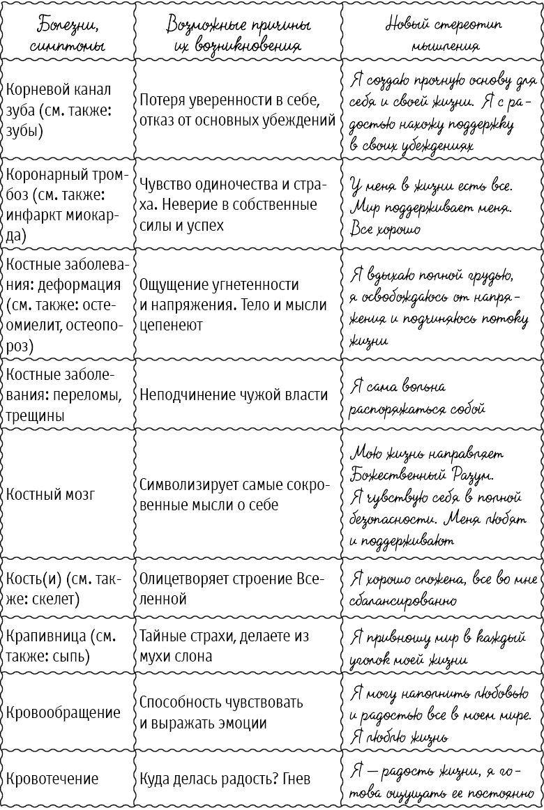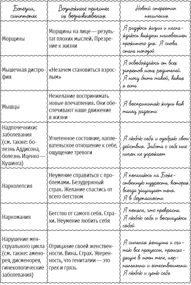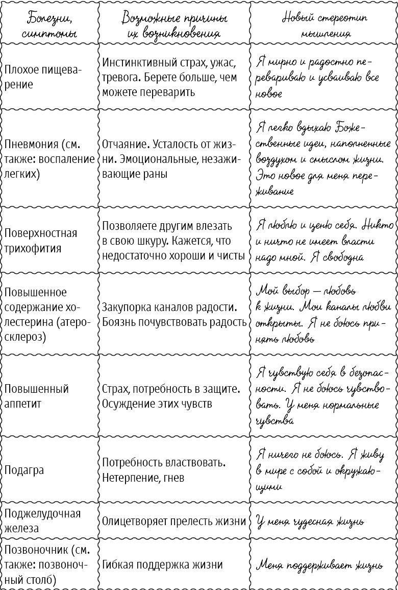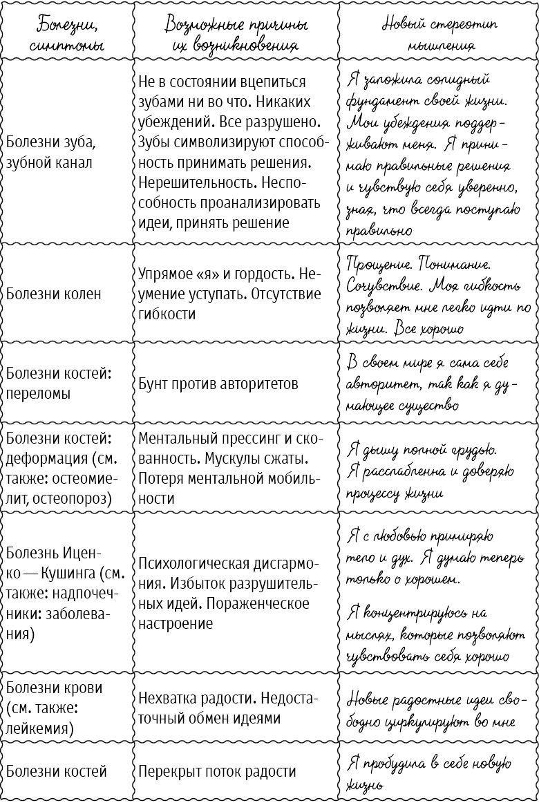 Наибольшее количество болезней тела вызывают следующие ментальные причины: критицизм, гнев, обида и вина. Например, критицизм, исповедуемый довольно долгое время, приводит людей к такому заболеванию, как артрит. Гнев в конечном итоге вызывает ожоги на теле и оставляет рубцы. Старые обиды пожирают человека и оборачиваются опухолями и раком. Вина всегда ищет наказание и ведет к боли. Насколько легче освободиться от негативных стереотипов мышления, пока мы здоровы, чем пытаться отделаться от них, будучи в панике от угрозы операции!