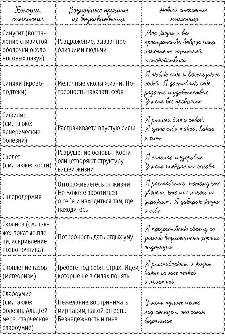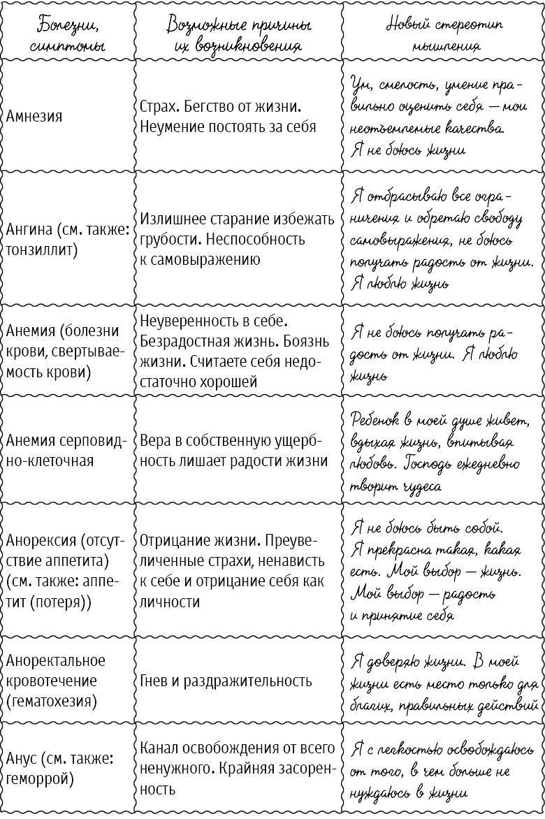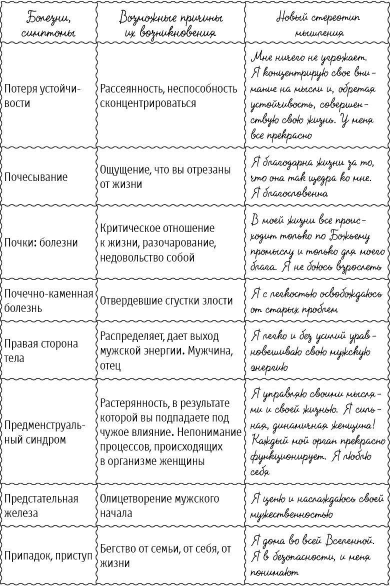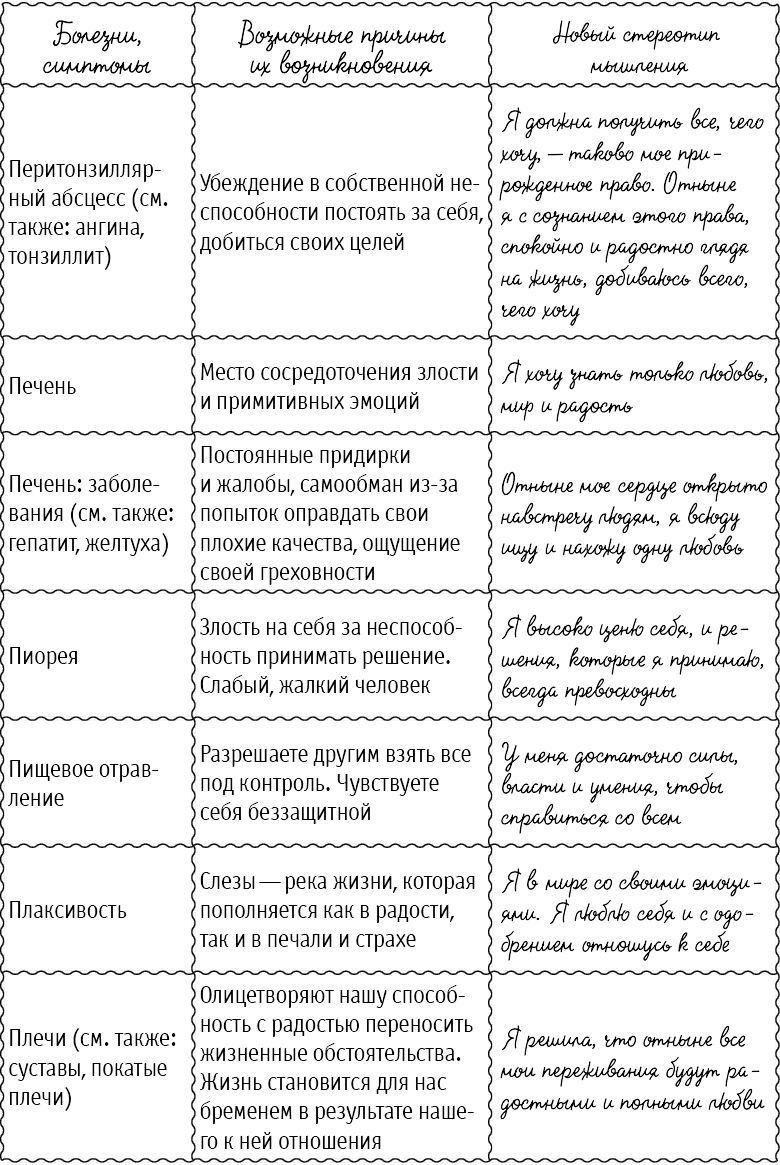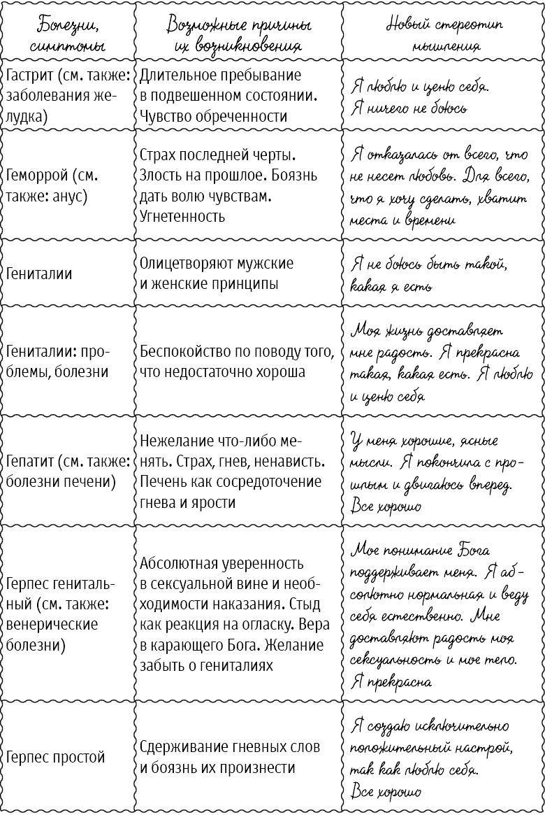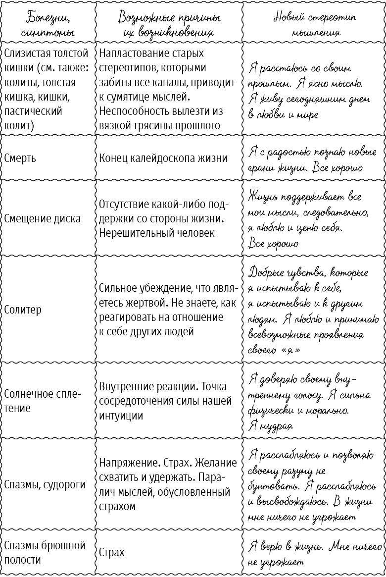 Наибольшее количество болезней тела вызывают следующие ментальные причины: критицизм, гнев, обида и вина. Например, критицизм, исповедуемый довольно долгое время, приводит людей к такому заболеванию, как артрит. Гнев в конечном итоге вызывает ожоги на теле и оставляет рубцы. Старые обиды пожирают человека и оборачиваются опухолями и раком. Вина всегда ищет наказание и ведет к боли. Насколько легче освободиться от негативных стереотипов мышления, пока мы здоровы, чем пытаться отделаться от них, будучи в панике от угрозы операции!
