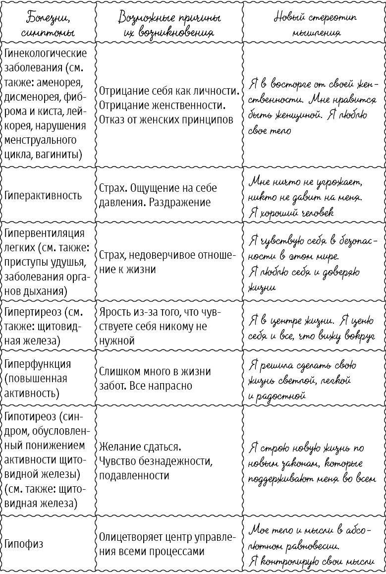 1. Найдите в перечне возможную психологическую причину своего недомогания, решите для себя, применим ли такой подход в вашем случае; если нет, подумайте и спросите себя, какие иные стереотипы мышления могли вызвать ваше недомогание.
