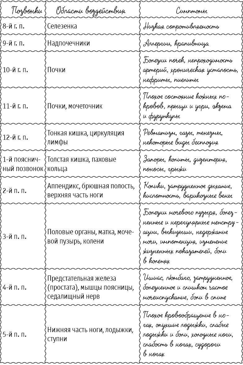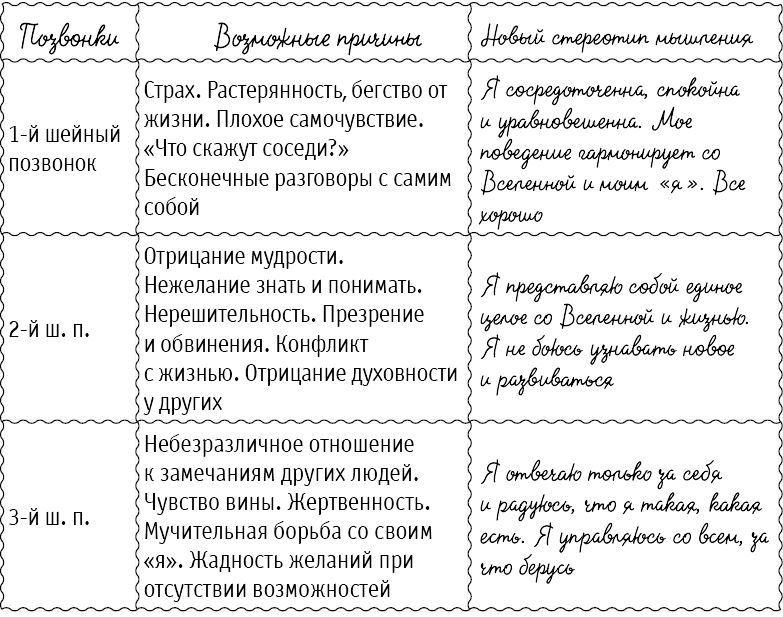 Болезни позвоночника настолько разнообразны, они мучают такое количество людей, что я решила посвятить позвоночнику отдельную главу. Я предлагаю вам изучить предложенную таблицу и содержащуюся в ней информацию, а затем соотнести таблицу с ментальными эквивалентами, приведенными ниже. Как всегда, полагайтесь на собственное чутье при выборе наиболее полезных для вас аффирмаций.