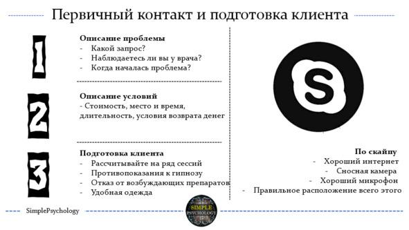 Первичный контакт направлен на краткое ознакомление с проблемой клиента, введение клиента в курс дела и объяснение содержания процесса гипнотерапии, выяснение ожиданий и развенчание мифов.