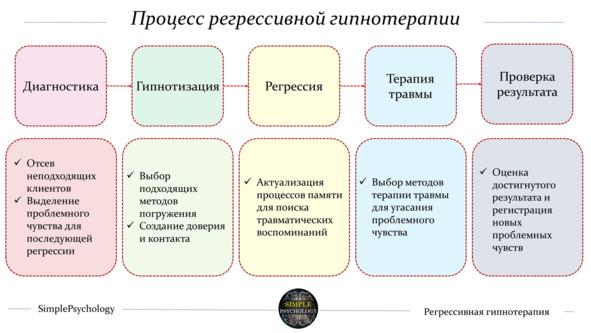 — Регрессия: актуализация процесса свободных ассоциаций и воспоминаний для поиска травмы. После наведения транса наша работа состоит в актуализации воспоминаний клиента путем применения техники регрессии. Чем выше гипнабельность, тем более директивные техники регрессии мы можем использовать.