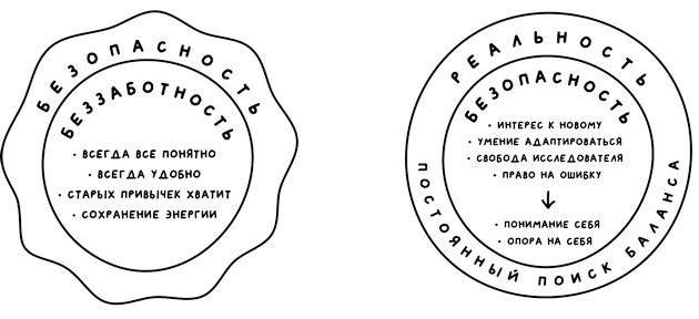 Безопасность = беззаботность (когда все понятно, всегда удобно, и старых привычек хватает, чтобы выживать, идти никуда не нужно) – это системная иллюзия, которую поддерживает мозг для сохранения энергии.