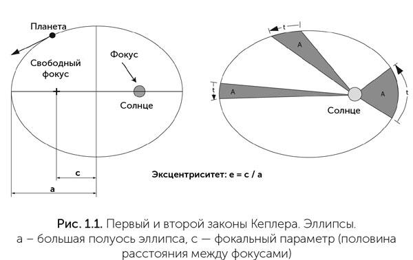 С переходом к гелиоцентрической системе мира стало понятно, что видимое движение планет складывается из двух: обращения Земли вокруг Солнца и обращения наблюдаемой планеты вокруг него же. Поначалу думали, что планеты обращаются вокруг Солнца тоже по круговым деферентам и эпициклам, но более точные измерения Тихо Браге в XVI веке показали, что эта модель не согласуется с наблюдениями. Иоганн Кеплер, анализируя записи Браге в начале XVII века, сформулировал три эмпирических закона движения планет вокруг Солнца (рис. 1.1).