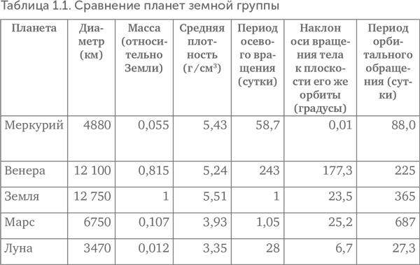 Четыре внутренние планеты Солнечной системы — Меркурий, Венера, Земля и Марс — объединяются в земную группу. Они состоят из металлического ядра и силикатных мантии и коры, в отличие от планет-гигантов. Луна, хотя и не является планетой, по химическому составу также близка к планетам земной группы (рис. 1.2).