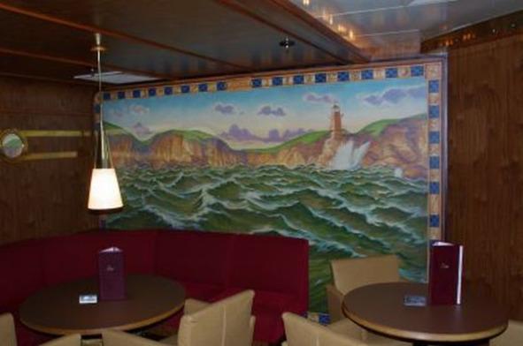 Приняв солнечные ванны, идем внутрь лайнера. Везде висят копии картин голландского художника. Система освещения устроена так, что после фотовспышки словно солнечные блики, отраженные морской водой, играют на полотнах.