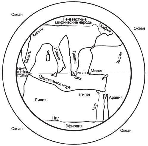Эта карта – реконструкция того, что, как считают, было первой когда-либо начерченной географической картой. Ее центр – Дельфы, где камень, называвшийся «пуп земли» (по-гречески «омфалос»), отмечал точный центр земли. Картографом, создавшим ее, был Анаксимандр, греческий философ, живший с примерно 611-го по 547 год до н. э. Ранние карты все были круглыми. Полвека спустя Геродот комментировал это так: «Мне смешно видеть, что так много людей до сих пор чертили карты Земли, но ни один из них не изобразил ее даже сносно: ведь они рисовали Землю круглой, словно она сделана с помощью компаса, и окружали ее рекой Океаном.