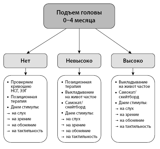 Малыш, который развивается нормотипично, уже с 3–4 месяцев способен подтягивать голову к груди, сгибать руки в локтях и напрягать пресс. Небольшое запрокидывание головы может наблюдаться до четырех месяцев [48]. В положении сидя такой ребенок свободно крутит головой, спинка сгорбленная, но это не мешает смотреть по сторонам.