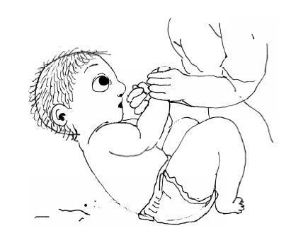 Вы вкладываете большие пальцы в ладошки ребенка, остальными же обхватываете его запястье. Затем медленно и плавно тянете малыша вверх до положения сидя.