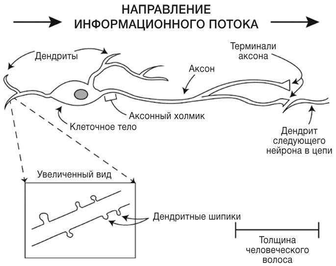 Нейроны бывают самых разных форм и размеров, но в их структуре есть много общего. Как и все животные клетки, нейрон окружен тонкой внешней мембраной. Нейрон обладает клеточным телом, содержащим клеточное ядро, в котором хранится генетическая информация, зашифрованная в ДНК. Клеточное тело может иметь треугольную, круглую и овальную форму, а его размер варьируется от 4 до 30 микрон в диаметре. Этот размер проще представить так: три клеточных тела, уложенные рядом, по толщине будут сравнимы с человеческим волосом. От клеточного тела отходят тонкие отростки, которые называются дендритами. Именно через них нейрон получает большинство химических сигналов от других нейронов. Дендриты могут быть короткими и длинными, веретенообразными и разветвленными — а у некоторых нейронов их вообще нет. Одни дендриты гладкие, другие покрыты крошечными выростами — дендритными шипиками. У большинства нейронов есть по меньшей мере несколько разветвленных дендритов, а также один длинный тонкий отросток, отходящий от тела клетки. Он называется аксоном и отвечает за передачу информации от нейрона.