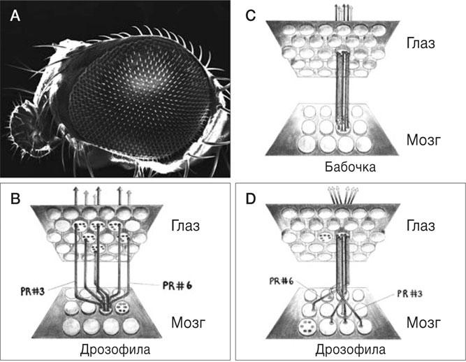 РИС. 2. Нейронные связи в глазу насекомого. (А) Поверхность глаза дрозофилы состоит из приблизительно 800 омматидиев. Обратите внимание на выпу