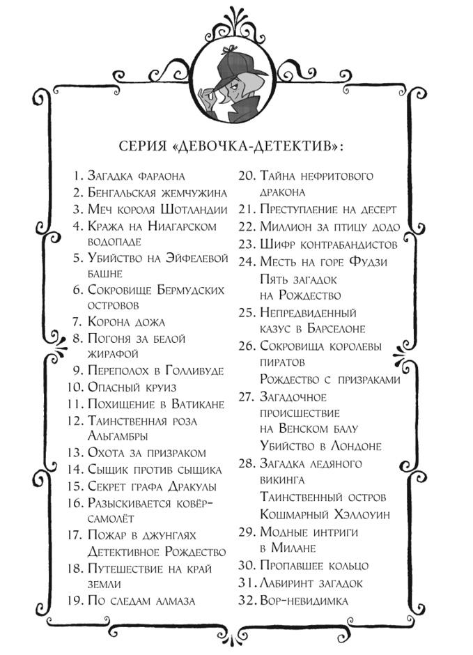 Наделённая потрясающим чутьём и феноменальной памятью, Агата Мистери мечтает стать писательницей. Но это в будущем, а пока она просто превосходная сыщица! Вместе со своим незадачливым кузеном Ларри, студентом детективной школы, она путешествует по миру, чтобы решать самые запутанные загадки. А помогают им преданный дворецкий, вредный сибирский кот и множество чудаковатых родственников.
