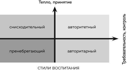 Стили воспитания определяются по двум осям в соответствии с уровнем принятия/тепла (ось Y) и уровнем требовательности/контроля (ось X).