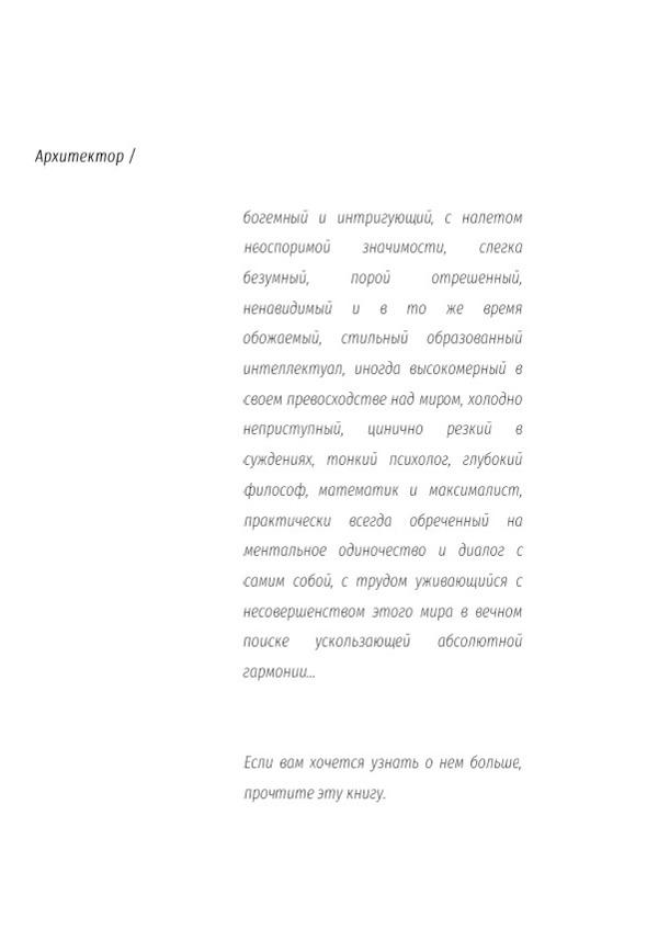 Так чем же столь гипнотичен образ архитектора, почему всё больше и больше молодых людей в поисках своего Я обращаются к этой профессии как к осознанному выбору дела жизни, в то время когда в мире существует множество других занятий, не менее интересных и куда более доходных? Вот вы, например, зачем-то взяли в руки именно эту книгу, и значит, при слове «архитектура» в вашем сознании происходит какая-то метаморфоза, которая пробуждает необъяснимое желание обладать этим удивительным искусством созидания гармонии из совокупности негармоничных предметов окружающего мира.