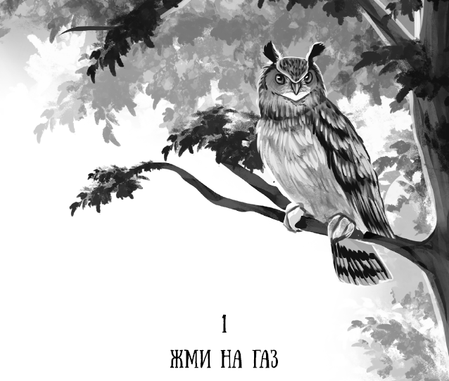 Вдруг, хлопая крыльями и с треском ломая еловые ветки, из лесу вылетела большая птица и уселась на конёк крыши бревенчатой хижины. Только когда она сложила крылья и уставилась на нас своими круглыми глазами, я по торчащим «ушам» в перьях поняла, что это филин. Он несколько раз моргнул, а потом повернул голову в сторону леса.